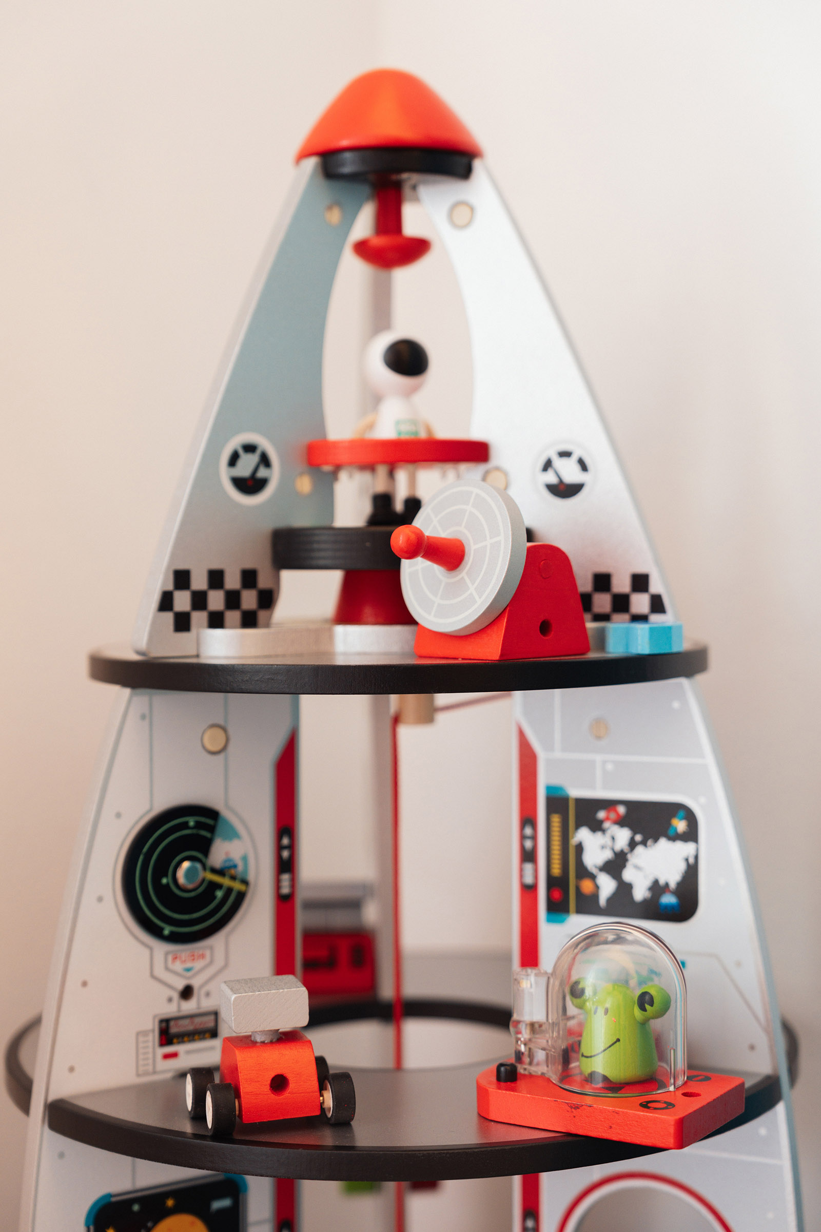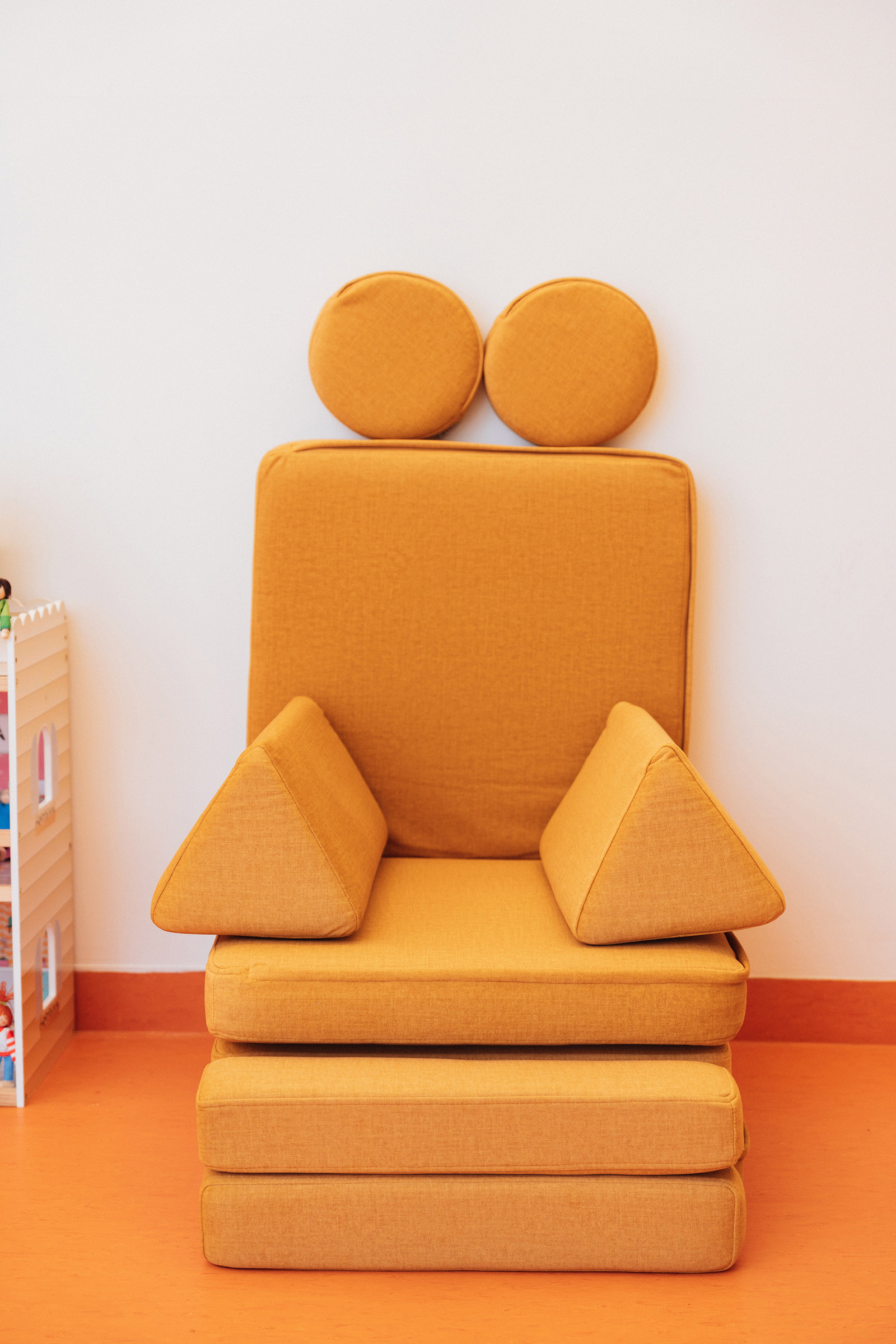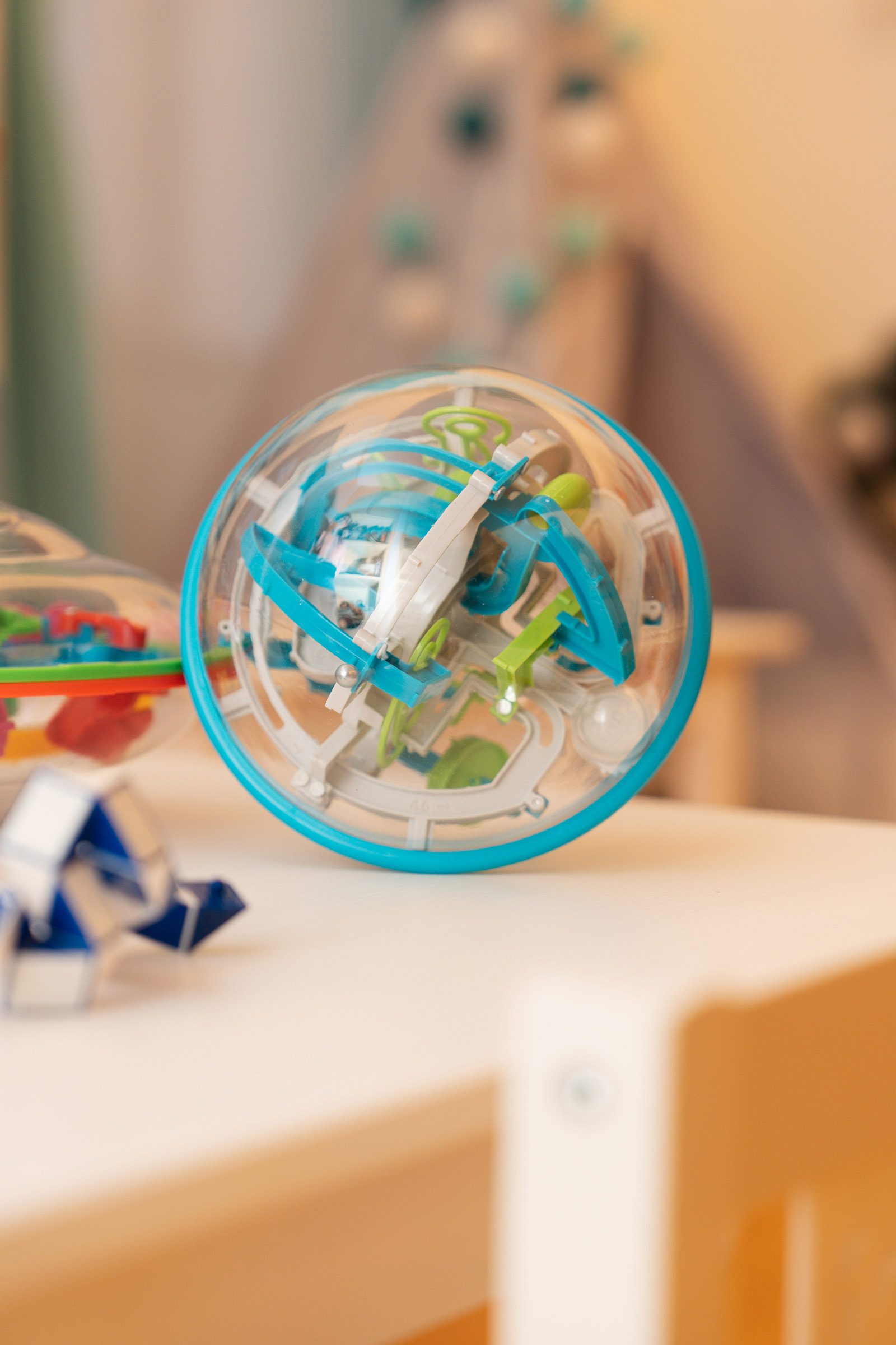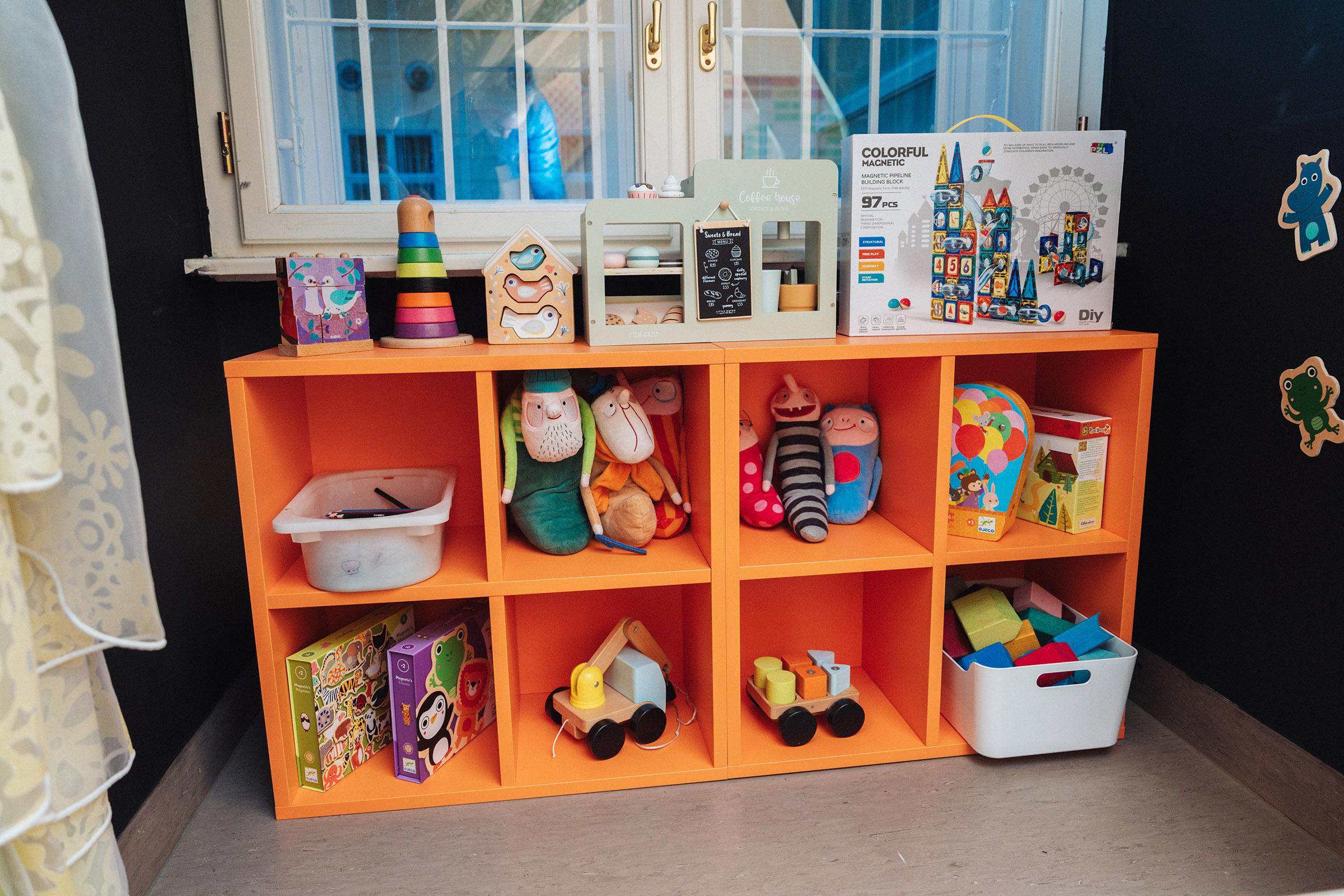 A játszószoba újragondolásánál is szem előtt tartottuk, hogy mindenki megtalálja kedvenc időtöltését. Éppen ezért a nagyobb iskolásoknak egy polcot logikai játékokkal pakoltunk tele, ami akár a szülőknek is kihívást jelenthet.