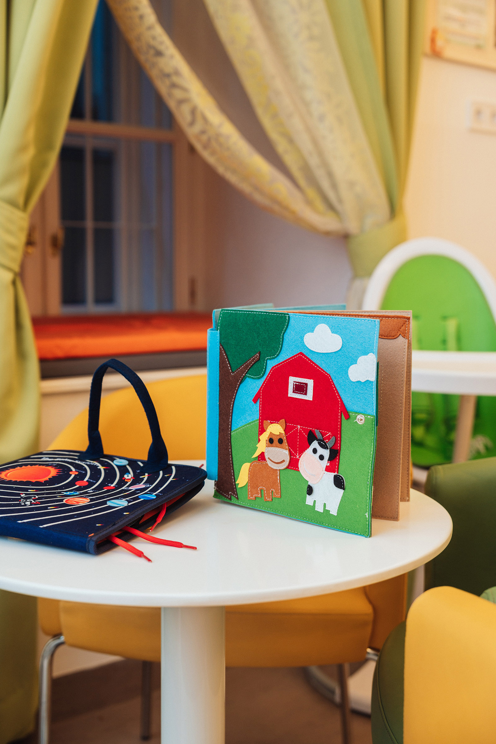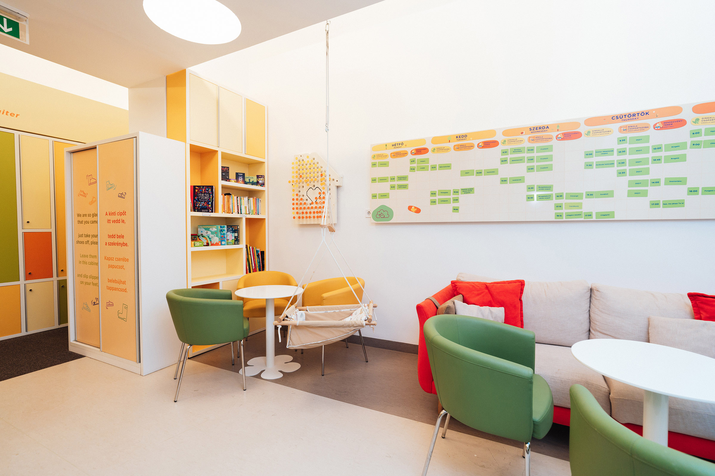 A legkisebbeket Adamo hintában ringathatjátok, az asztalokhoz pedig biztonságos etetőszékben tudjátok őket magatok mellé ültetni. Ha pedig kalandozni támad kedvük, számukra a textil- és fajátékokat alacsony polcokon helyeztük el, amit kedvükre pakolhatnak, nyitogathatnak.