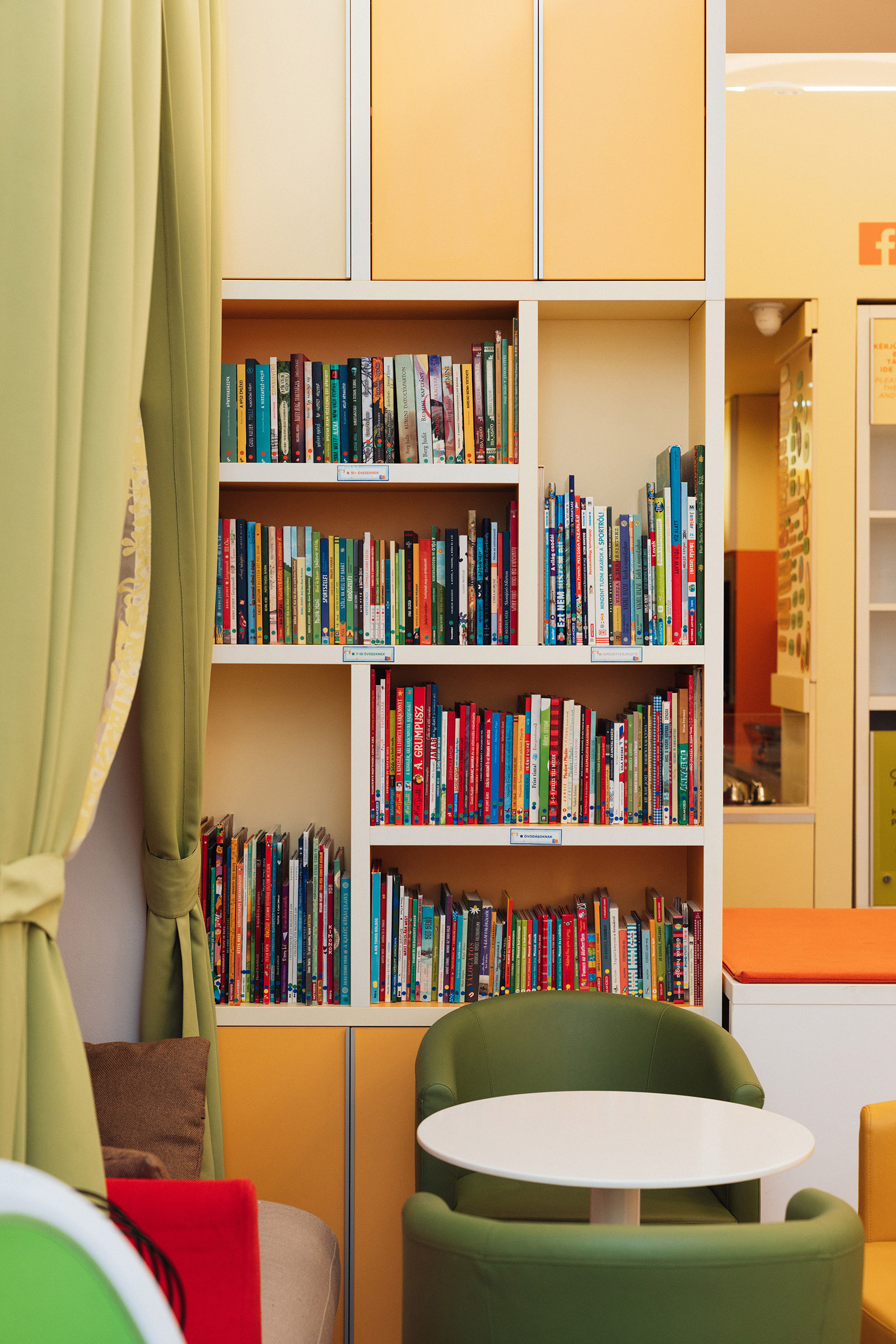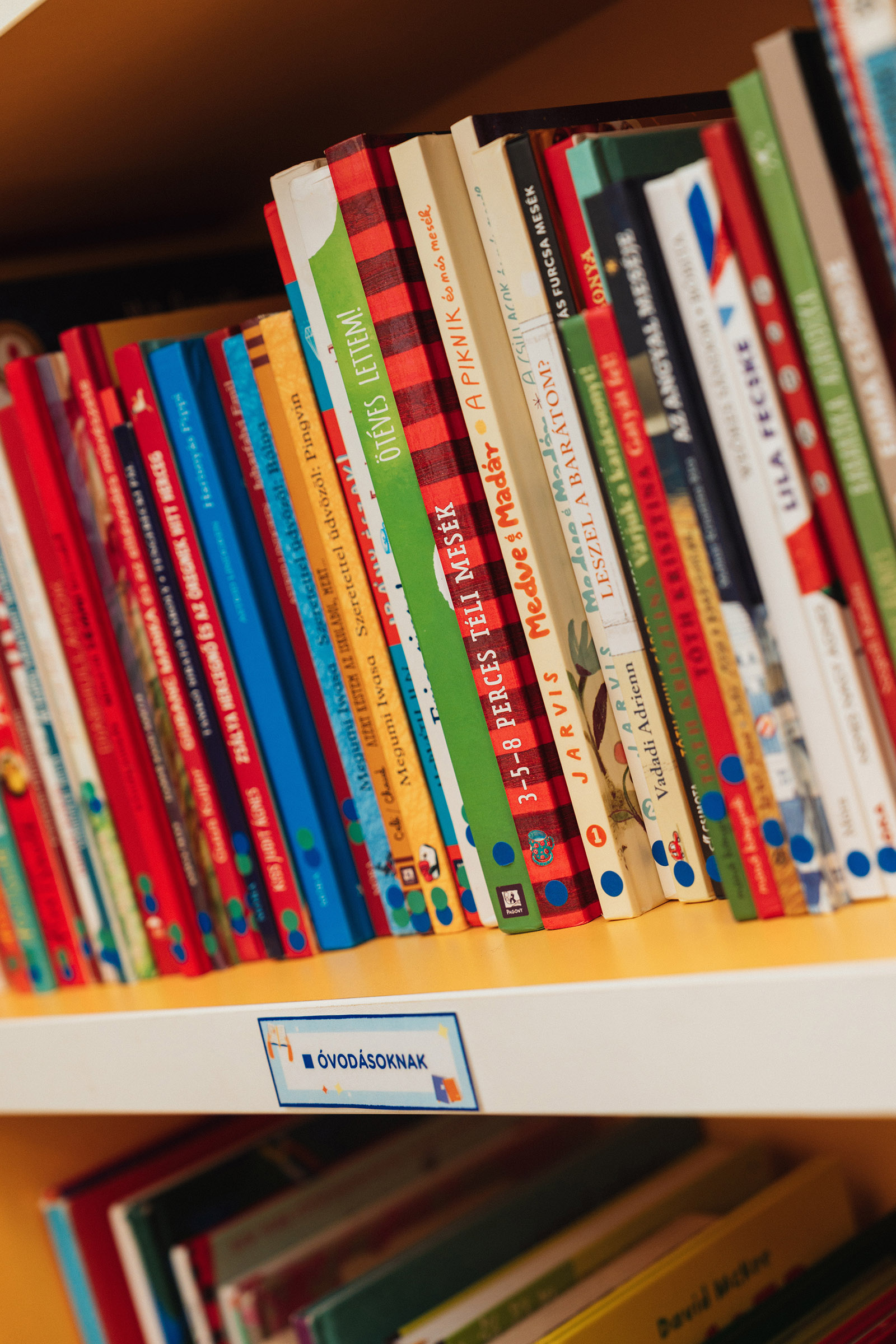 A könyveket színkódokkal láttuk el, melyeket a polcok élén is jelöltünk. Külön polcon helyeztük el a felnőtteknek szóló szakirodalmat, amiken fekete pöttyöt találtok. Bővítettük az angol nyelvű gyermekkönyv-kínálatot is, amit rózsaszín pötty mutat. Citromsárga jelölést kaptak a legkisebbeknek szóló leporellók, interaktív képeskönyvek, kéket az óvodás korosztálynak szánt irodalom. A kisiskolások számára a zölddel megjelölt, míg a 10 évesnél idősebb gyerekeknek a piros pöttyel ellátott könyveket ajánljuk leginkább. Ezüst színű jelölés mutatja az ismeretterjesztő irodalmat.