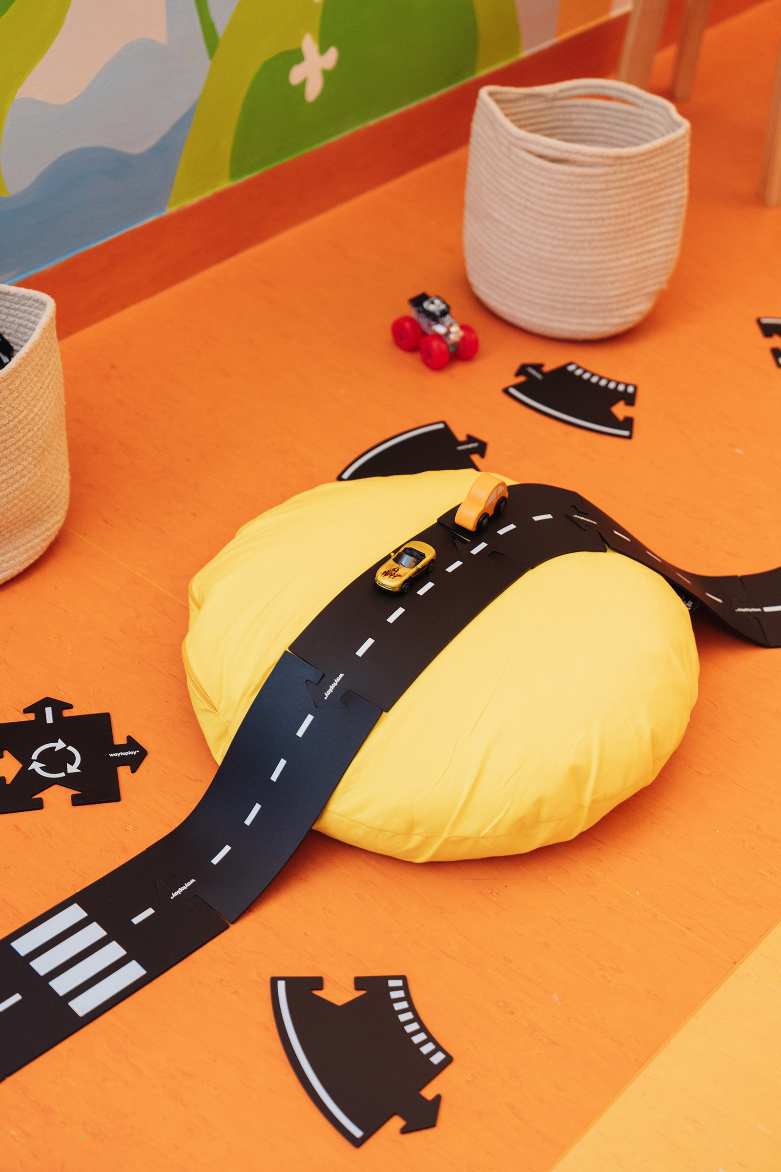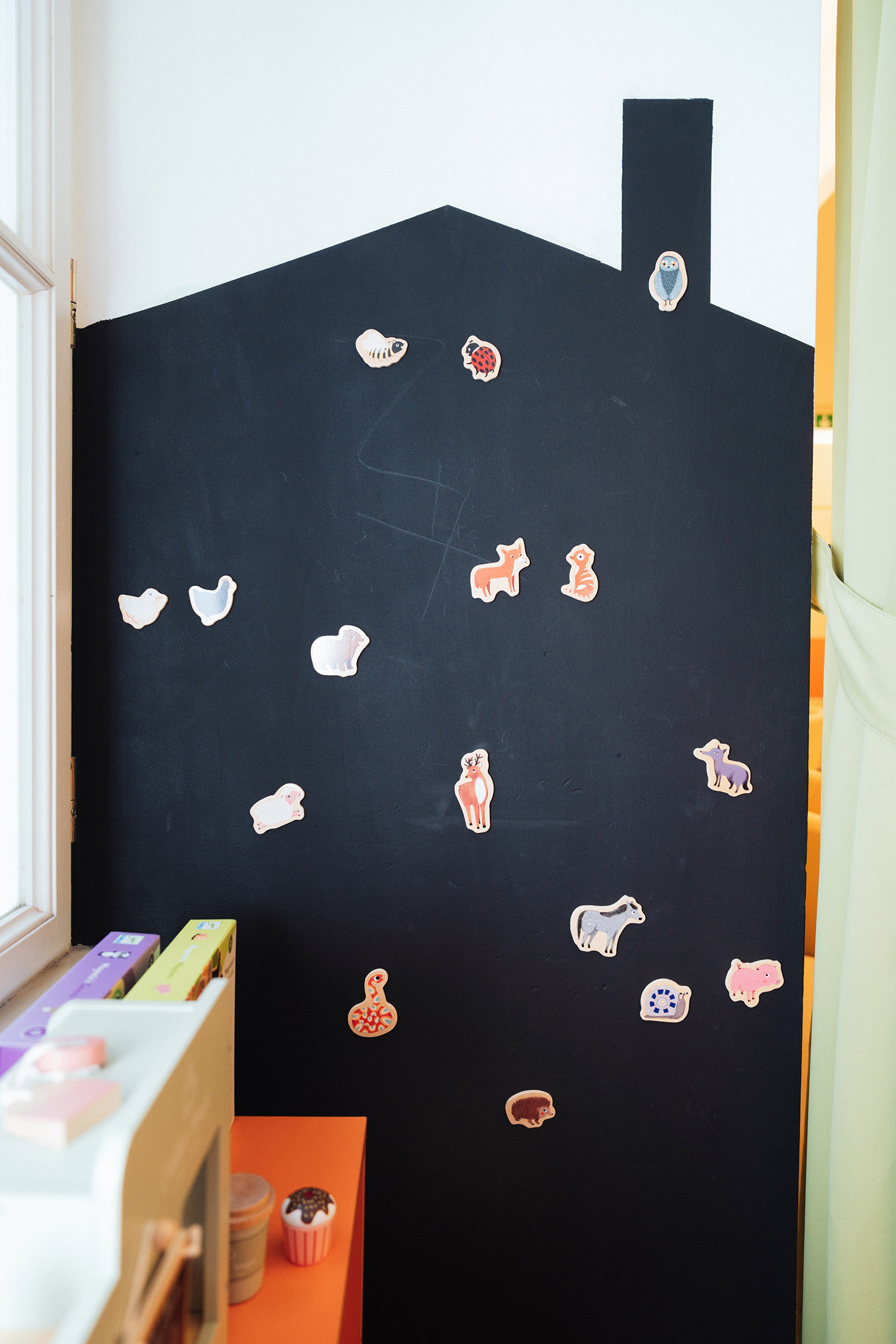 A kicsit nagyobbakat a matatófal és a mellette kialakított mágneses fal kötheti le hosszabban. Itt mágneses játékokat is találtok, a kihelyezett kisasztalnál a gyerekek rajzolni is tudnak.