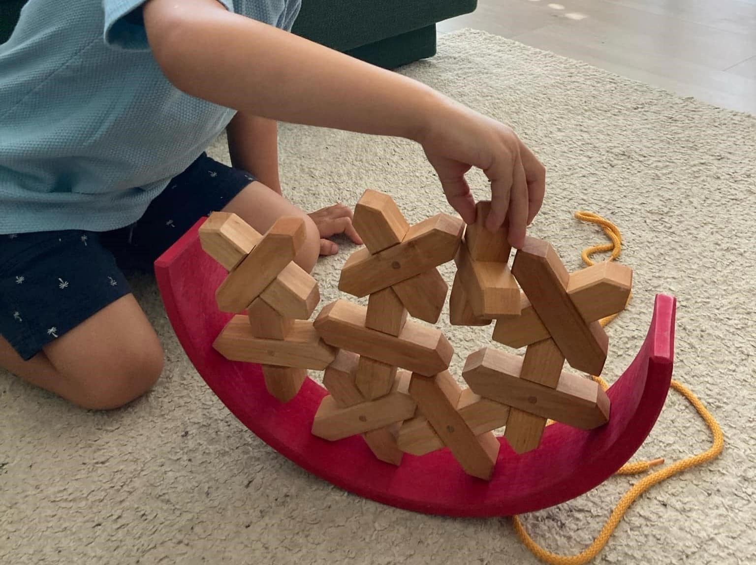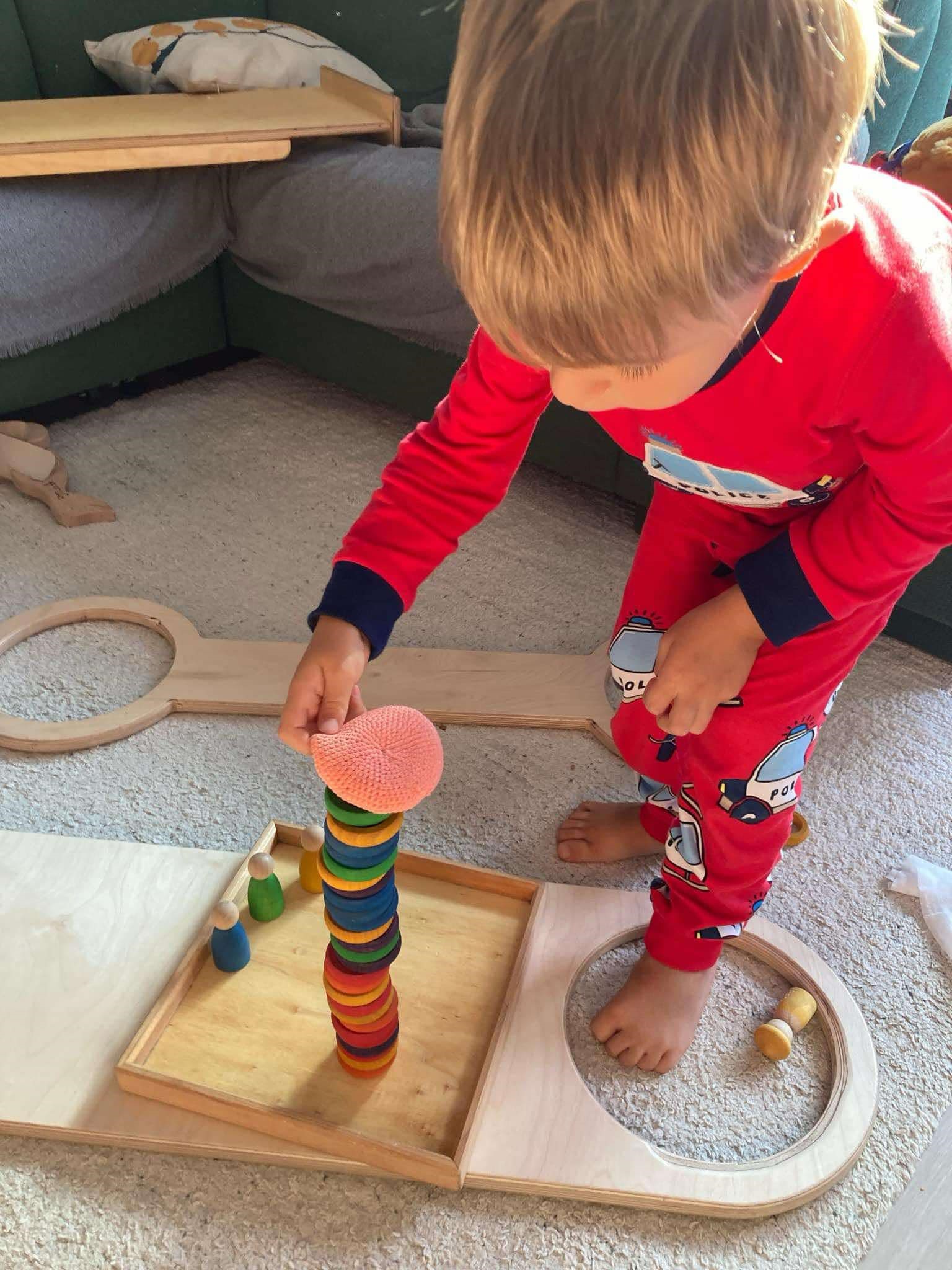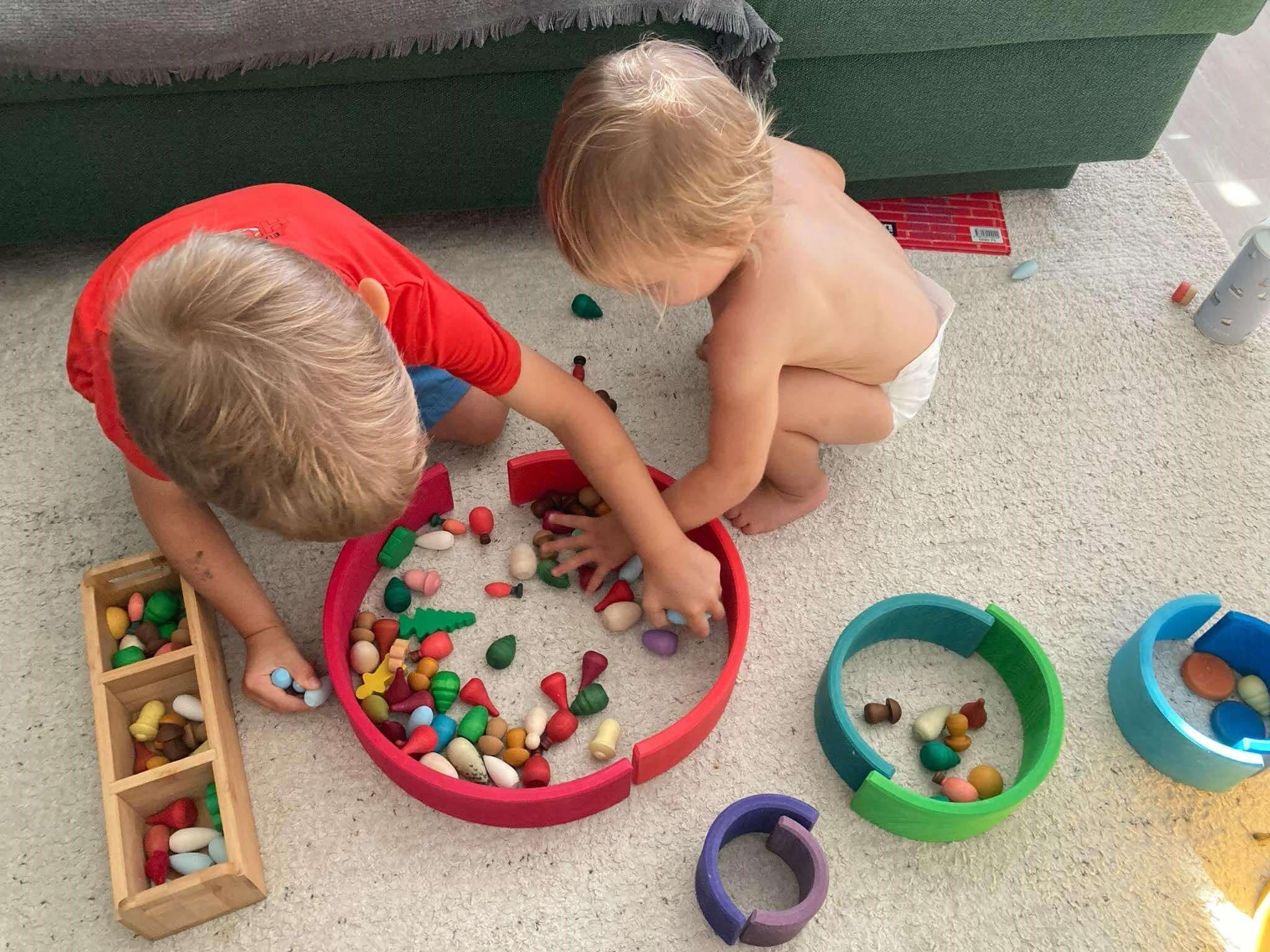 Saját magammal kapcsolatban aztán lett egy szomorú felismerésem: én egyáltalán nem tudok nyílt végű játékokkal játszani. Általában 2, maximum 3 féle felhasználás jutott az eszembe magamtól, hogy mit is tudnánk a szivárvány elemeiből építeni, hogyan tudom várrá kombinálni a fa építőhasábokat, a játszóselymeket és a mágneses csempéket. A férjem ezzel szemben egészen fantasztikus és spontán módon kreatív az összes ilyen játékunkkal, és néha csak irigykedve nézem, milyen ötletei vannak. Én sokszor keresek ötleteket az interneten például golyópályákhoz, vagy egyszerűen csak a gyermekeimre hagyatkozva bekapcsolódom abba, amit éppen játszani kezdtek. Legutóbb például egy állat úszóvilágbajnokságon voltam bíró.