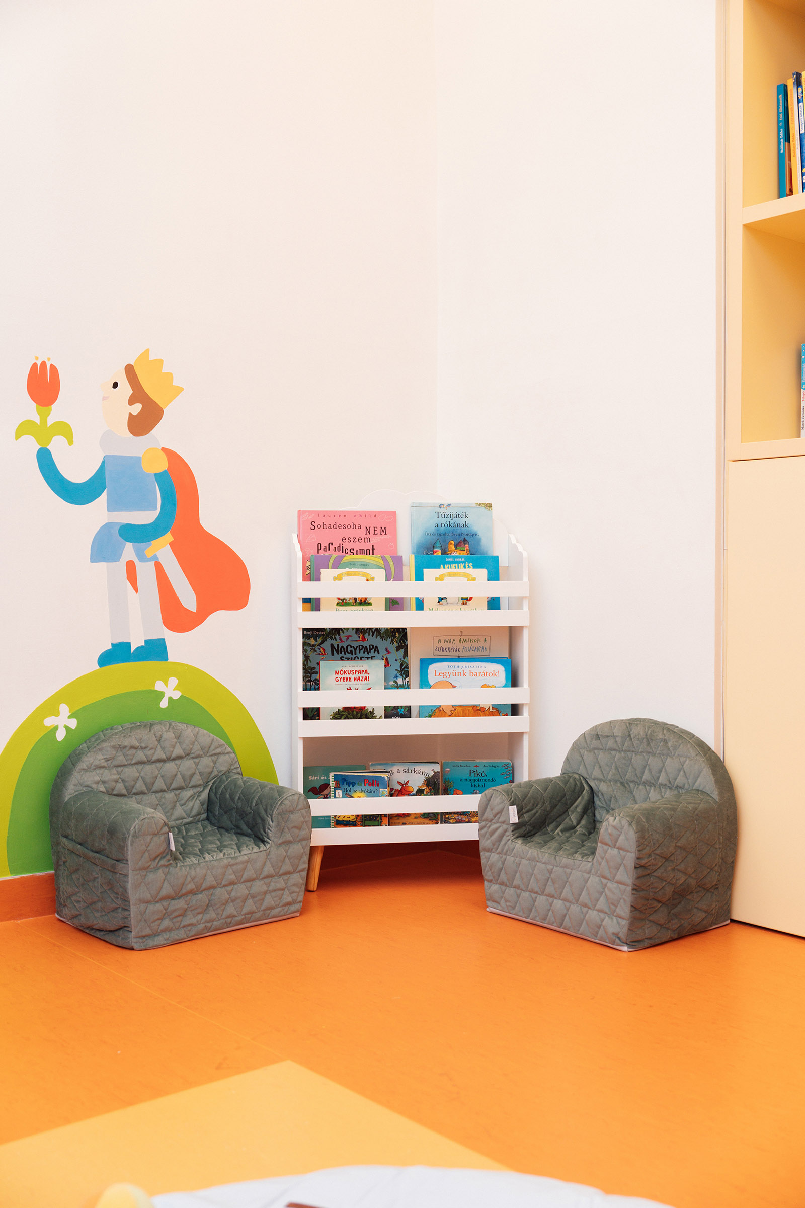 A Meseerdő gyermekfelügyeletbe érkező gyerekekkel nap mint nap előkerülnek a könyvek. A kedvencek közé tartoznak a Pipp és Polli történetek, de a Boribon, vagy a Tölgyerdő meséi könyvsorozatot is sokat lapozzuk a legkisebbekkel. Julia Donaldson mesekönyvei mindig nagy sikert aratnak, és mi felnőttek is szívesen vesszük le a Meseerdő polcairól. Ám nem csupán könyvekkel kalauzoljuk el a gyermekeket a mesék világába. A diavetítést heti rendszerességgel építjük be a tevékenységek közé, ami nagy élményt jelent minden korosztálynak. A papírszínházat szintén nagyon kedvelik a gyerekek, sokszor az ő kérésükre is előkerül. Ezért is bővítjük és színesítjük nagy gyakorisággal a diafilmek és papírszínházas mesék repertoárját. A mesebábok segítségével is új élményt nyújtva adunk át történeteket a csoportnak. Ezeket később más tevékenységekbe is beépítjük: a rajzolás, festés, gyurmázás során előkerülnek a megjelenített szereplők, helyszínek, vagy a megélt érzelmek kifejezése.