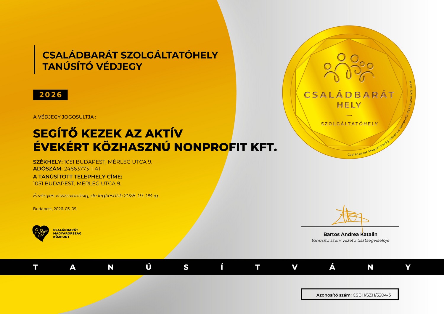 A Belvárosi Közösségi Teret működtető Segítő Kezek Kft. 2026-ban újra elnyerte a Családbarát Munkahely és a Családbarát Szolgáltatóhely védjegyeket. Társaságunk 2021 óta viselheti a Családbarát Magyarország Központ elismeréseit, amelyeket kétévente szakmai szempontok alapján újítanak meg. Büszkék vagyunk arra, hogy a belvárosi családok iránti elkötelezettségünket újabb sikeres minősítések bizonyítják. Kattints az oklevelekre a nagyobb mérethez! A családbarát szemlélet a hozzánk látogatókra és a munkatársakra is vonatkozik, ezáltal támogató munkakörnyezetet biztosítunk kollégáink számára, a családok részére pedig magas színvonalú programokat és szolgáltatásokat kínálhatunk. Ez a bejegyzés is érdekelhet: Ez már a hatodik! Idén is elnyertük a Családbarát Munkahely díjat A Belvárosi Közösségi Teret működtető Segítő Kezek az Aktív Évekért Közhasznú Nonprofit Kft. immár hatodik alkalommal nyerte el a Családbarát Munkahely díjat. A jövőben is azért dolgozunk, hogy a családbarát szemlélet meghatározó része legyen mindennapi működésünknek. Ez a bejegyzés is érdekelhet: Ismét a legjobbak közé kerültünk az Év Felelős Foglalkoztatója pályázaton Nagy büszkeség számunkra, hogy a Belvárosi Közösségi Teret működtető Segítő Kezek Kft. az OFA Nonprofit Kft. „Az Év Felelős Foglalkoztatója 2025” pályázaton az egyéb gazdálkodó …